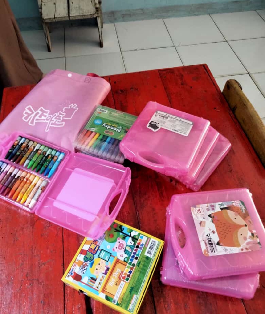 인도네시아는 아직 1차 생산국에 속하기 때문에 공산품들이 많이 비싸고 미술재료는 특히나 비싸답니다. 저는 당연히 크레파스를 준비해 보냈는데 제 아이 빼고는 파버카스텔 짝퉁 색연필… 그 분위기에서 제 아이만 쓰게 할 수 없겠더라고요.
