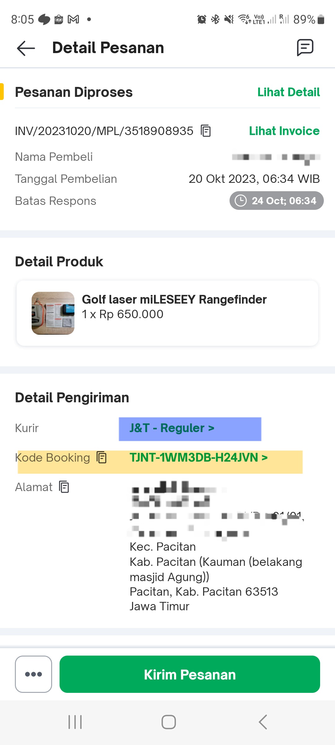 4. 최종 판매되었으면, Tokopedia에서 판매되었다고 알림 : 여기서 중요한 것은 구매자가 선택한 배송업체와 배송업체 코드를 알아놔야 함!!(중요)