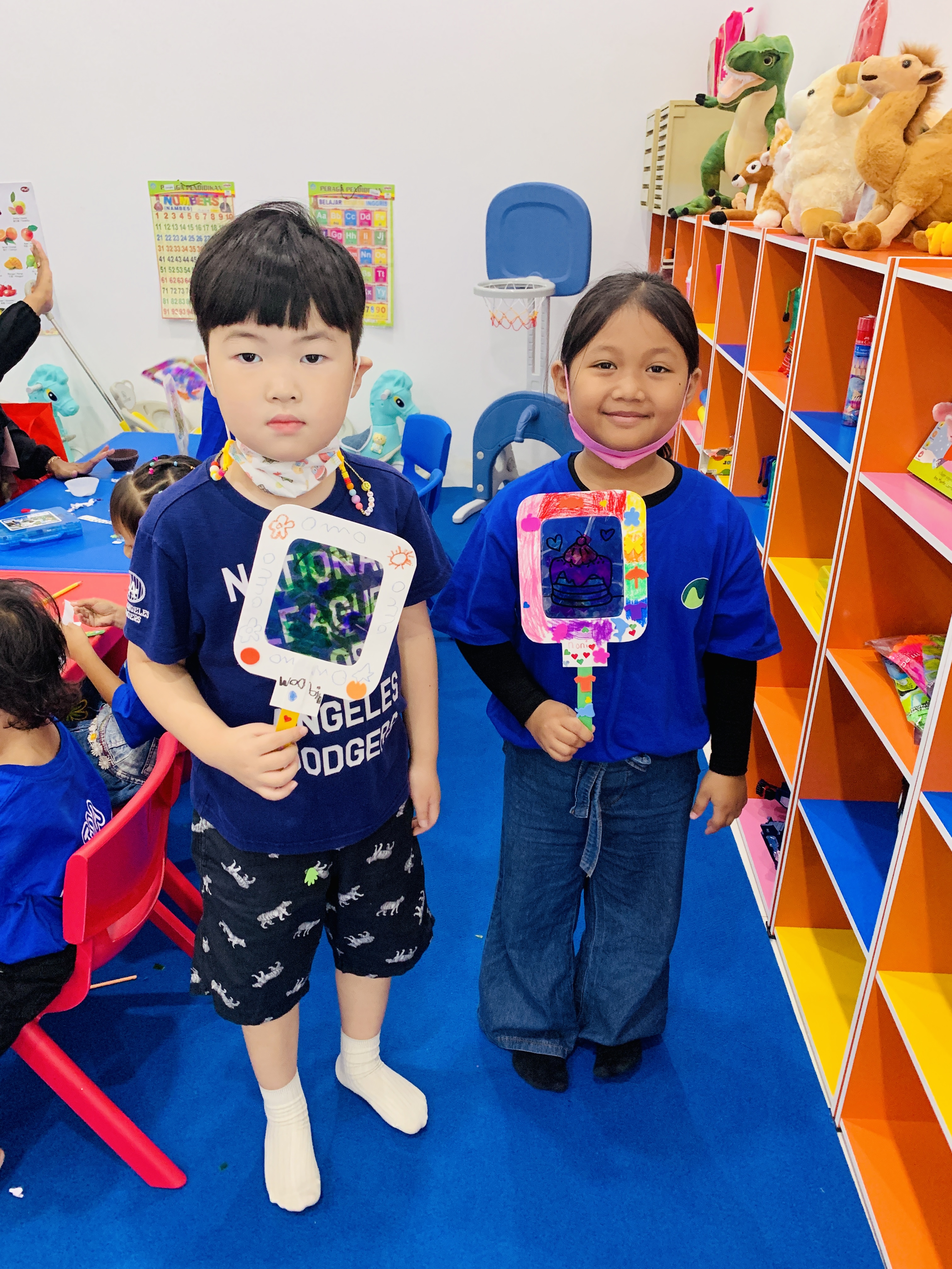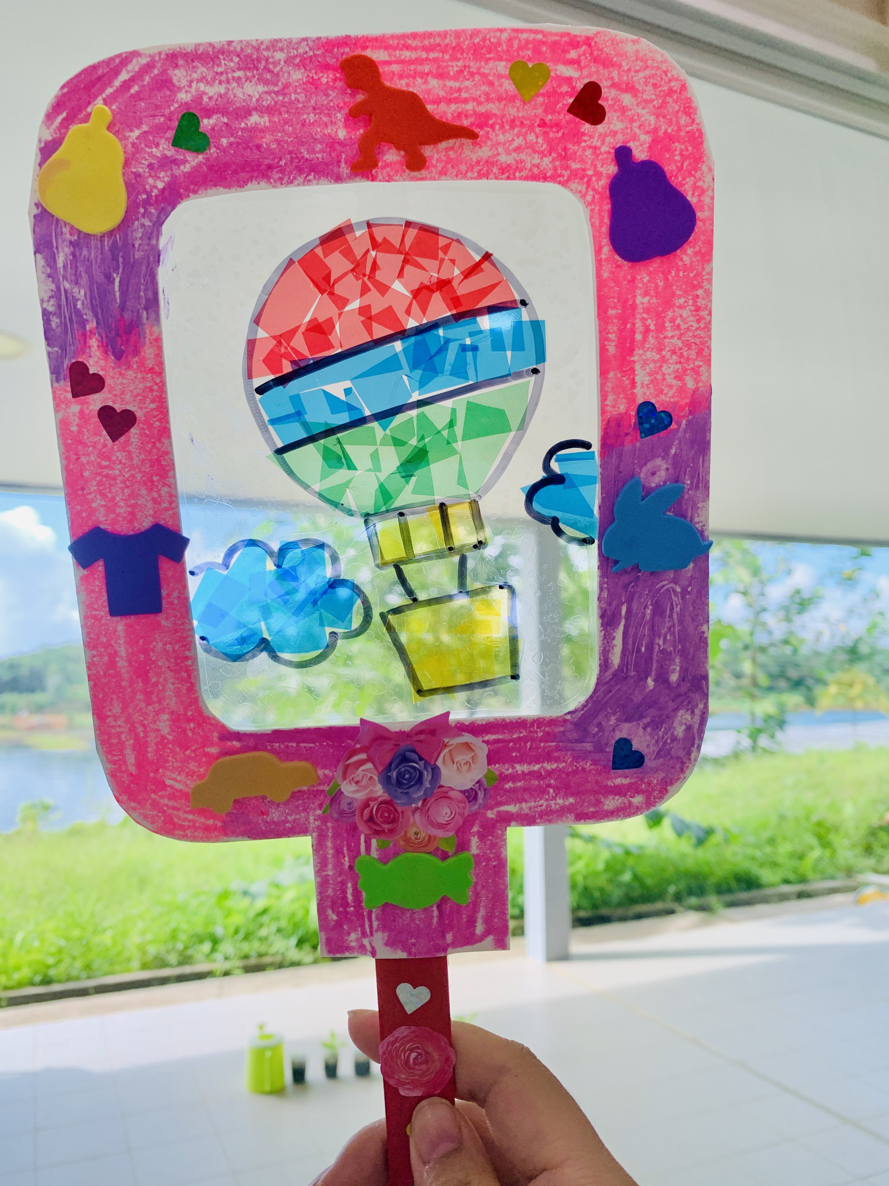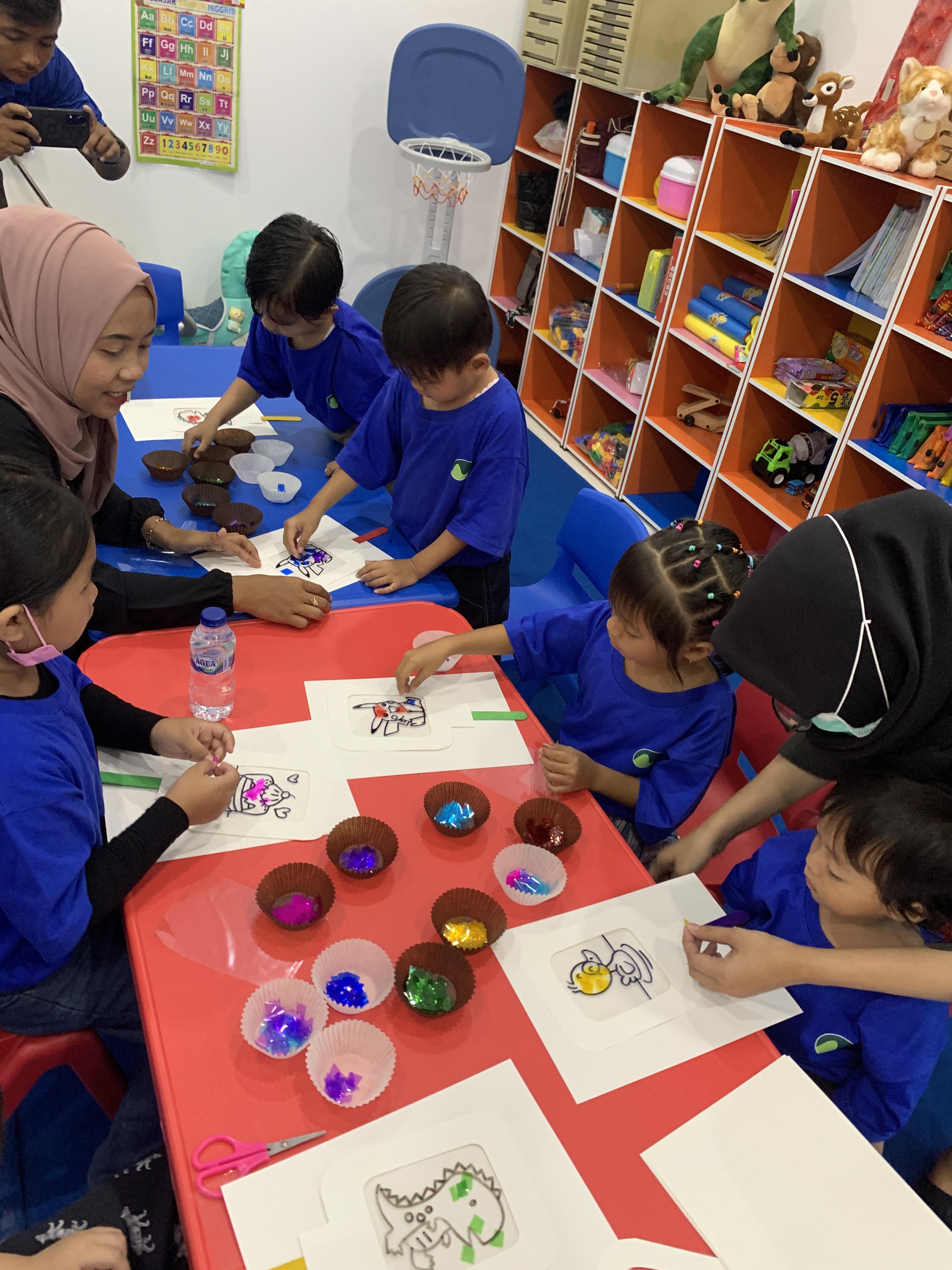 셀로판지를 통해 스테인드글라스 기법에 대해 알아보고 스테인드 글라스 부채를 만들었어요. 이곳 인도네시아에서도 색유리로 만든 창문을 많이 사용하기에 아이들에게도 친숙한 주제입니다. 부채형태이기 때문에 집에 가져가서도 좀 더 오래 가지고 놀 수 있겠지요?^^
