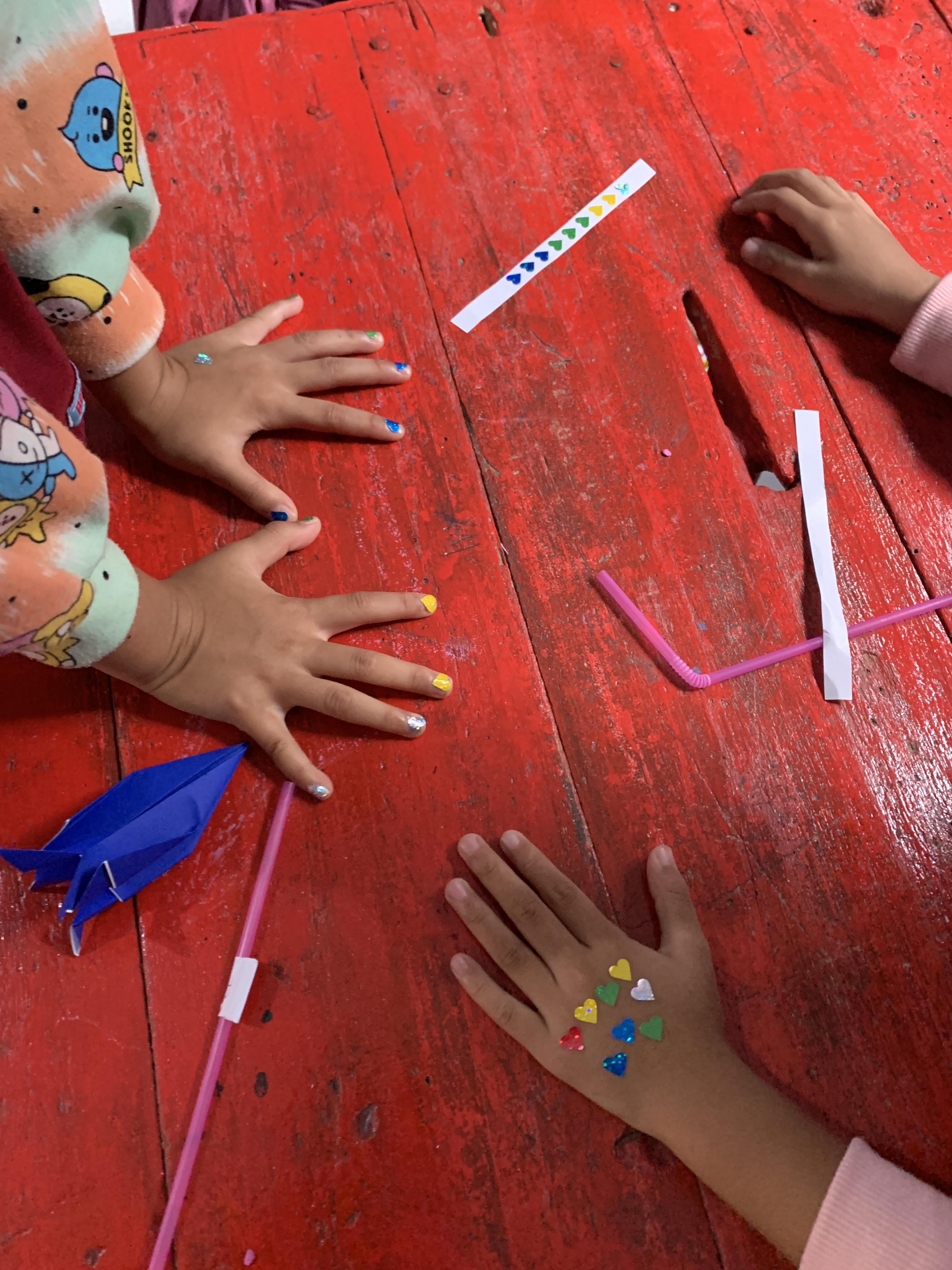 홀로그램 스티커를 처음 본 아이들. 한국에서 흔하디 흔한 재료이지요. 아이들이 햇빛에 영롱하게 반짝이는 홀로그램 스티커를 황홀하게 쳐다보는데 저도 모르게 울컥하는 마음이 들었습니다. 어찌 놀지 몰라 제가 잘라 준 스티커를 멀뚱히 들고 있길래 손톱에 붙여주니 너무 좋아했어요^^
