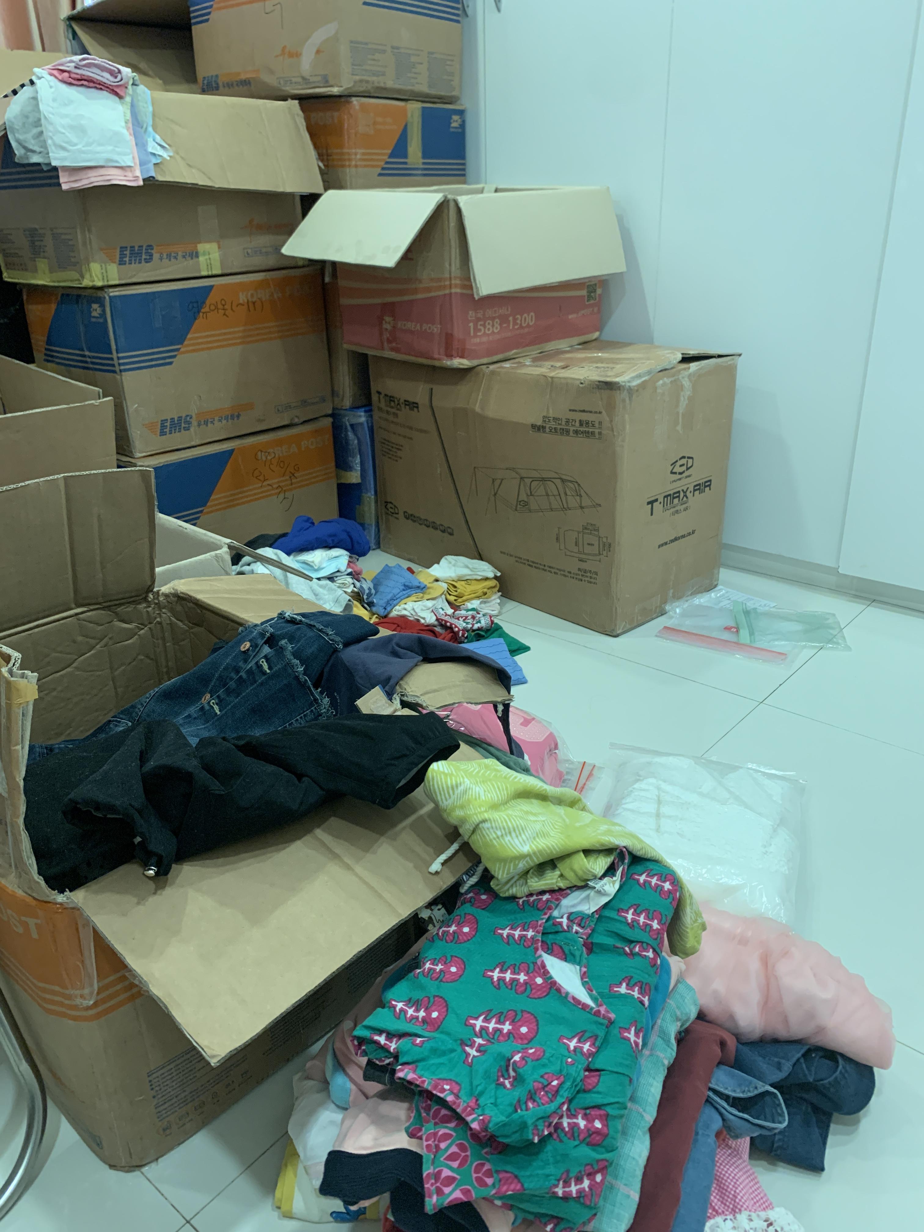 의류는 분실 위험과 습기에 의한 손상이 우려되어 저희집에 가져와 저 혼자 정리를 하였어요. 워낙 습기가 높은 나라이다 보니 창고에 두면 이틀만 지나도 하얀 곰팡이가 필 수 있거든요.