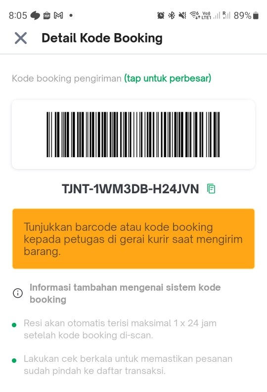 - 내 물건 구매자가 선택한 배송업체는 "J&T expres"였고, kode booking을 선택하면 하기의 사진처럼 바코드가 나온다.