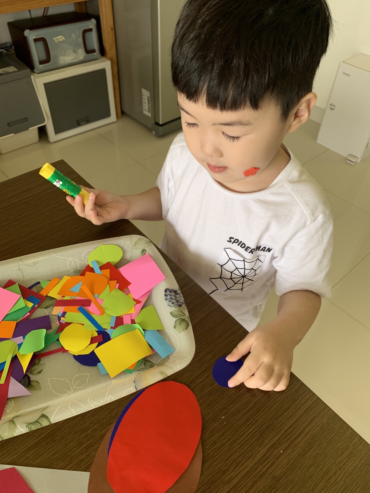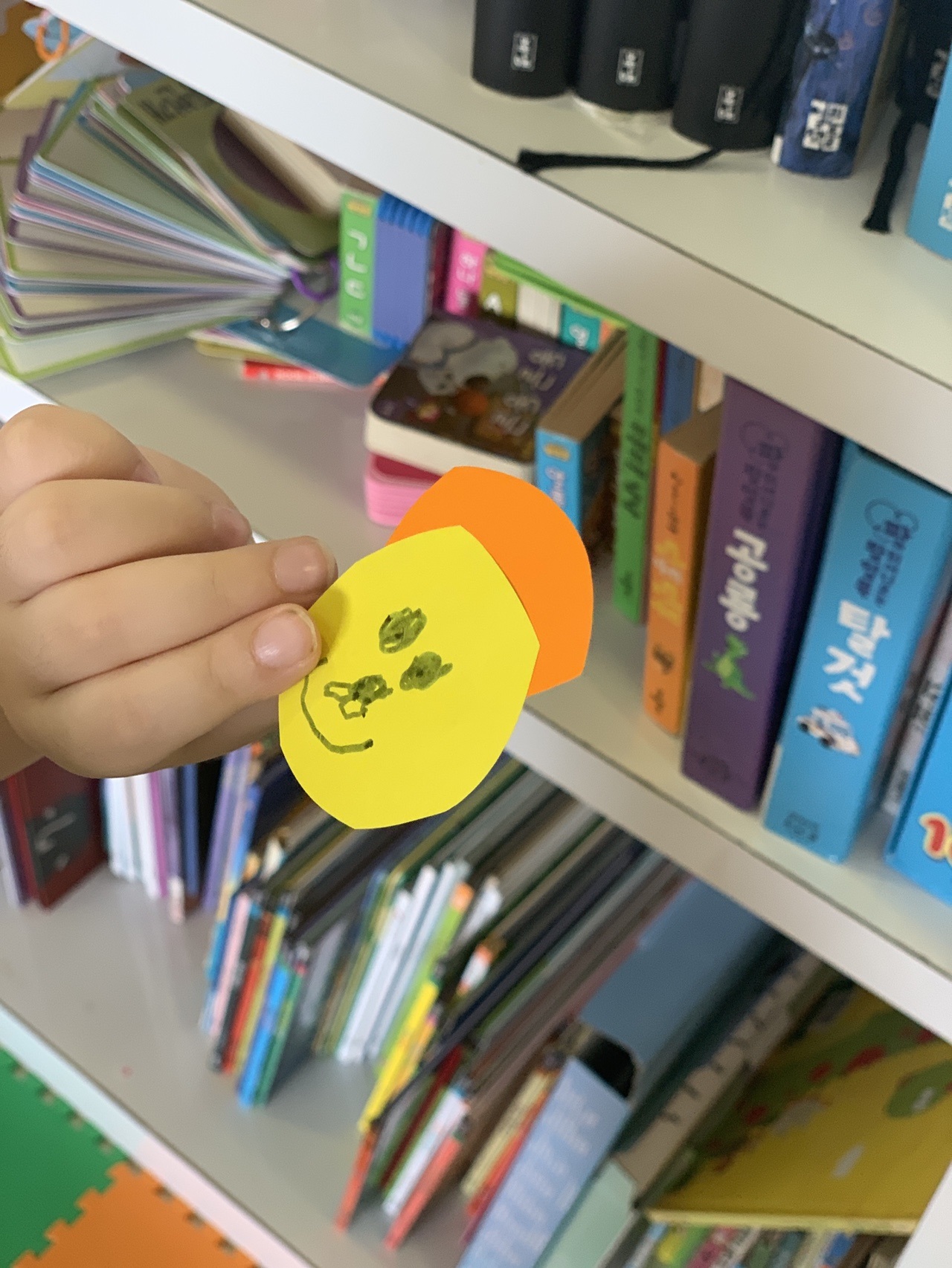 몸의 형태를 고민하길래 제가 옆에서 둥글게 보이는 색종이를 찾아 선택의 폭을 좁혀줍니다.