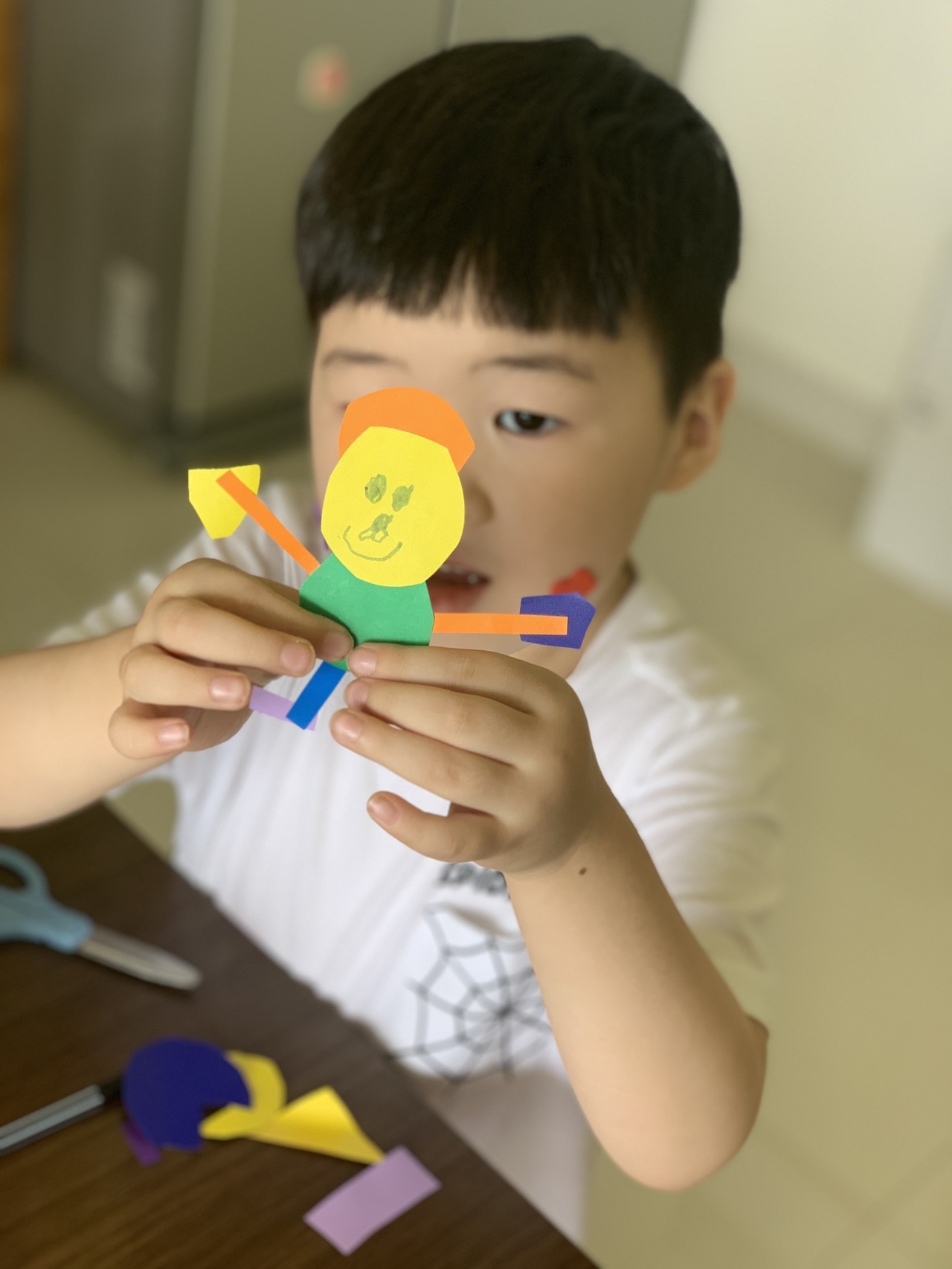첫째가 사람을 그릴때 팔 다리를 선 하나로 끝내고 발과 손은 그리기 않아 사람을 만들어보면서 관찰을 자연스럽게 해보게 하려고 주제를 사람으로 정했고요, 굳이 주제 정하지 않고 해도 되지만 그러면 오히려 산만해지기 쉬우므로 쉬운 주제 하나를 가지고 부모님과 함께 진행해보면 이후 자유주제를 주어도 아이들 스스로 조형주제를 이미 생각하고 진행할 수 있습니다.