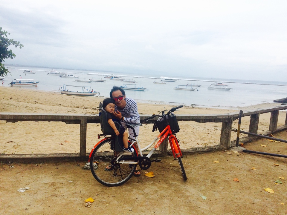 자전거에서 느끼는 바다바람과 조용한 사누르해변 분위기 때문인지 뀰뀰이가 졸기 시작하더니 고개도리질을 하기 시작했어요