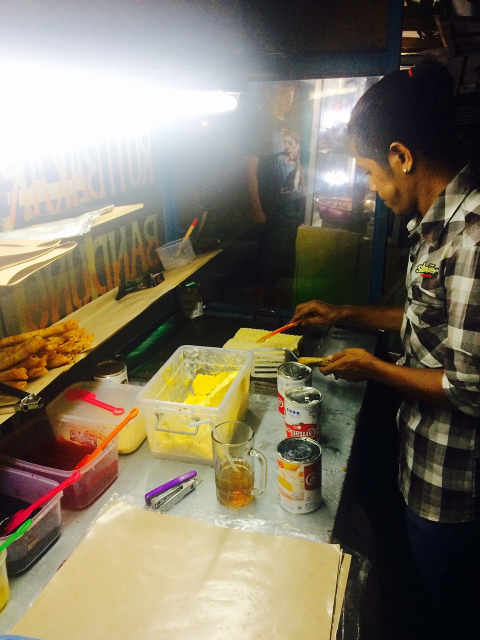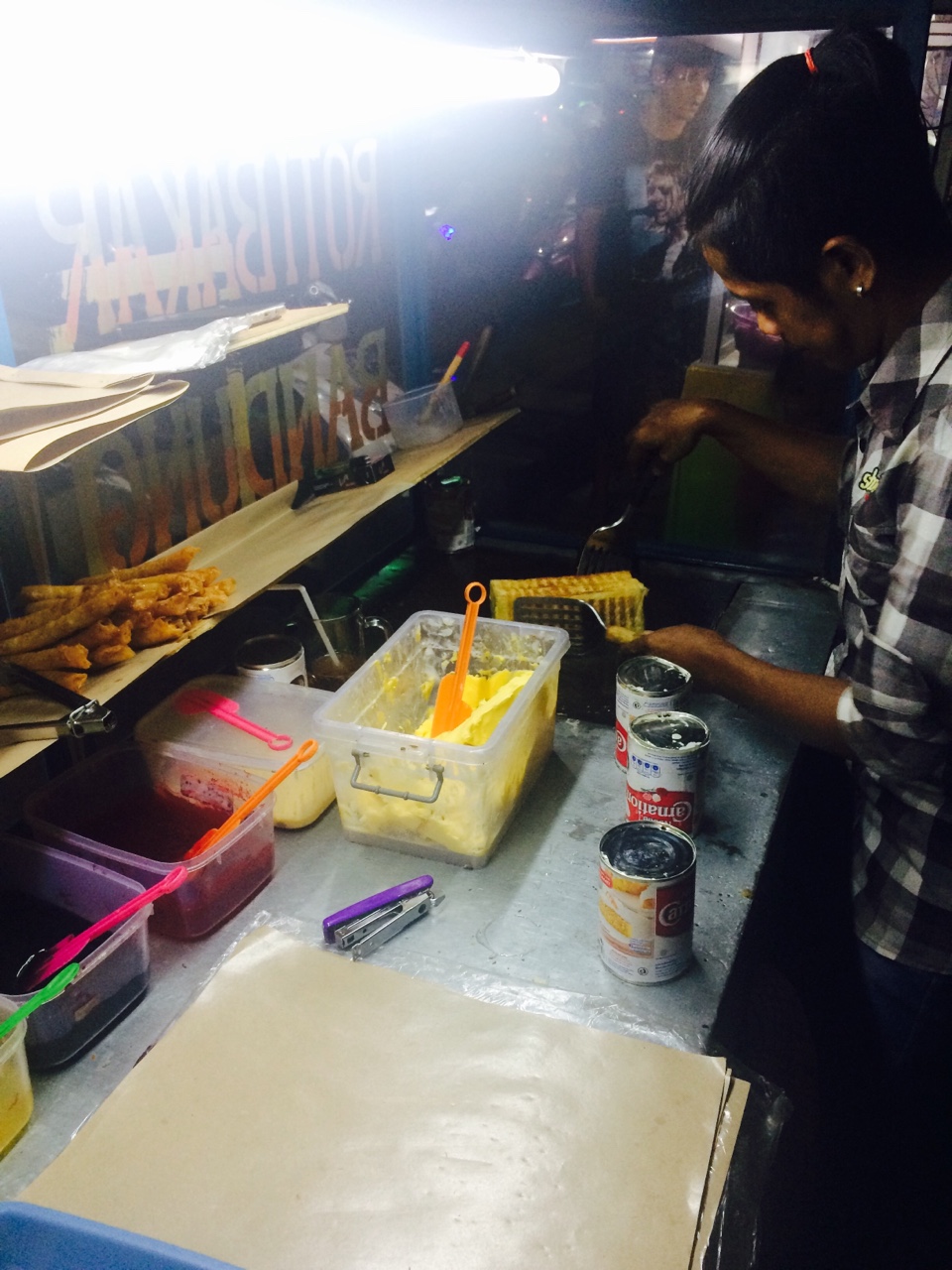 로띠바까르(Roti Bakar)라는 군것질은 토스트에 일종인데 미니사이즈의 통식빵에 손님이 원하는토핑을 샌드해 마가린에 뜨끈하게 굽는 요리예요