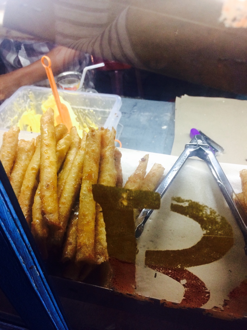 로띠바까르와 함께파는 길다란 과자는 바나나를 넣은얇은밀가루피를 기름에 튀겨 설탕옷을 입힌 과자입니다. 하나 시식해 보라해서 먹었는데 겉은 빠스같이 설탕옷이 바삭하고 안에는 촉촉한 바나나가 들어있었어요