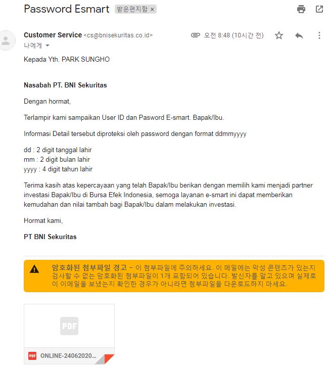 - 메일내용과 첨부파일을 확인해보면, 주식계좌 번호 및 개인주식투자자 등록번호 등에 대해 안내해 준다.