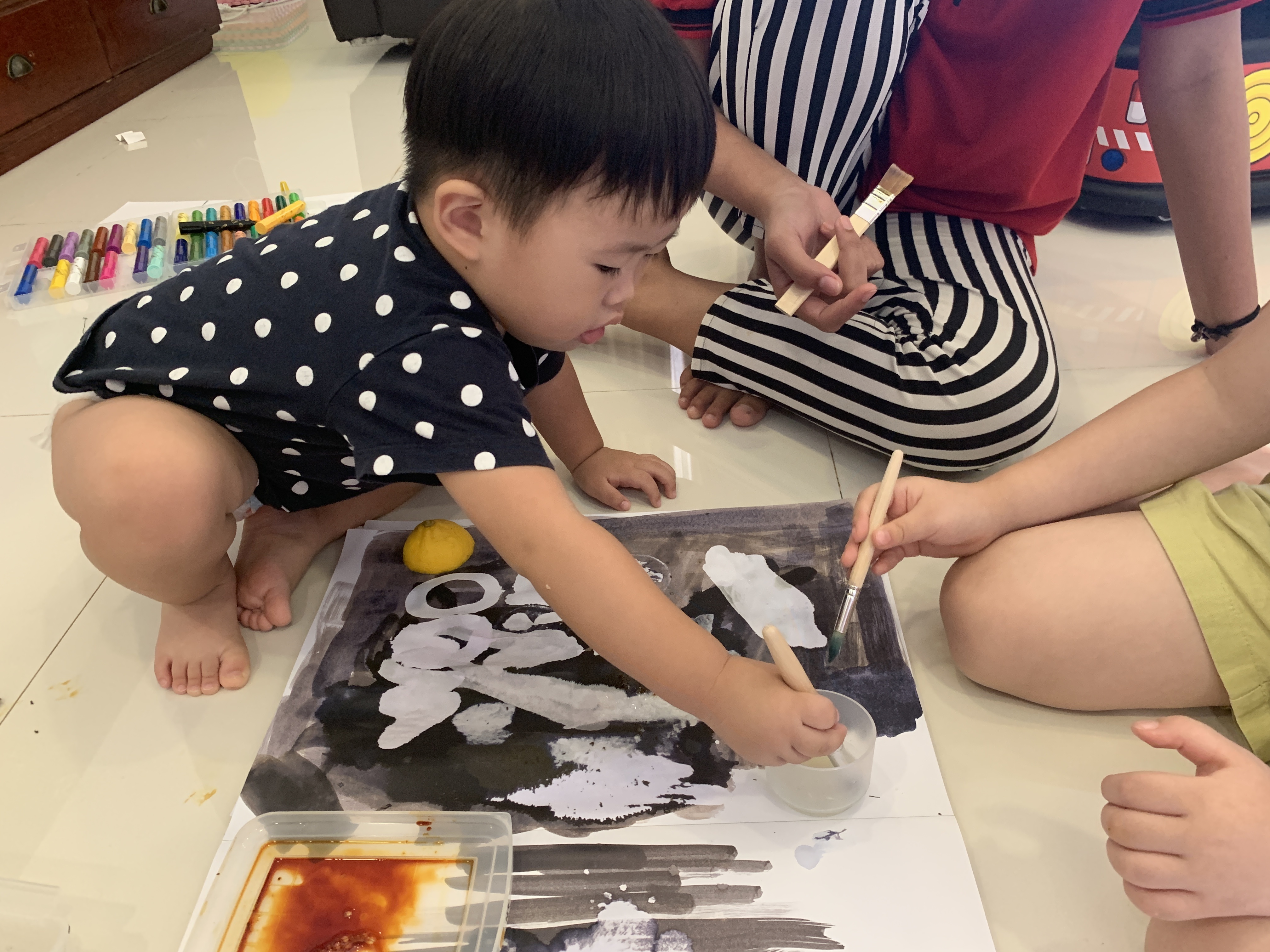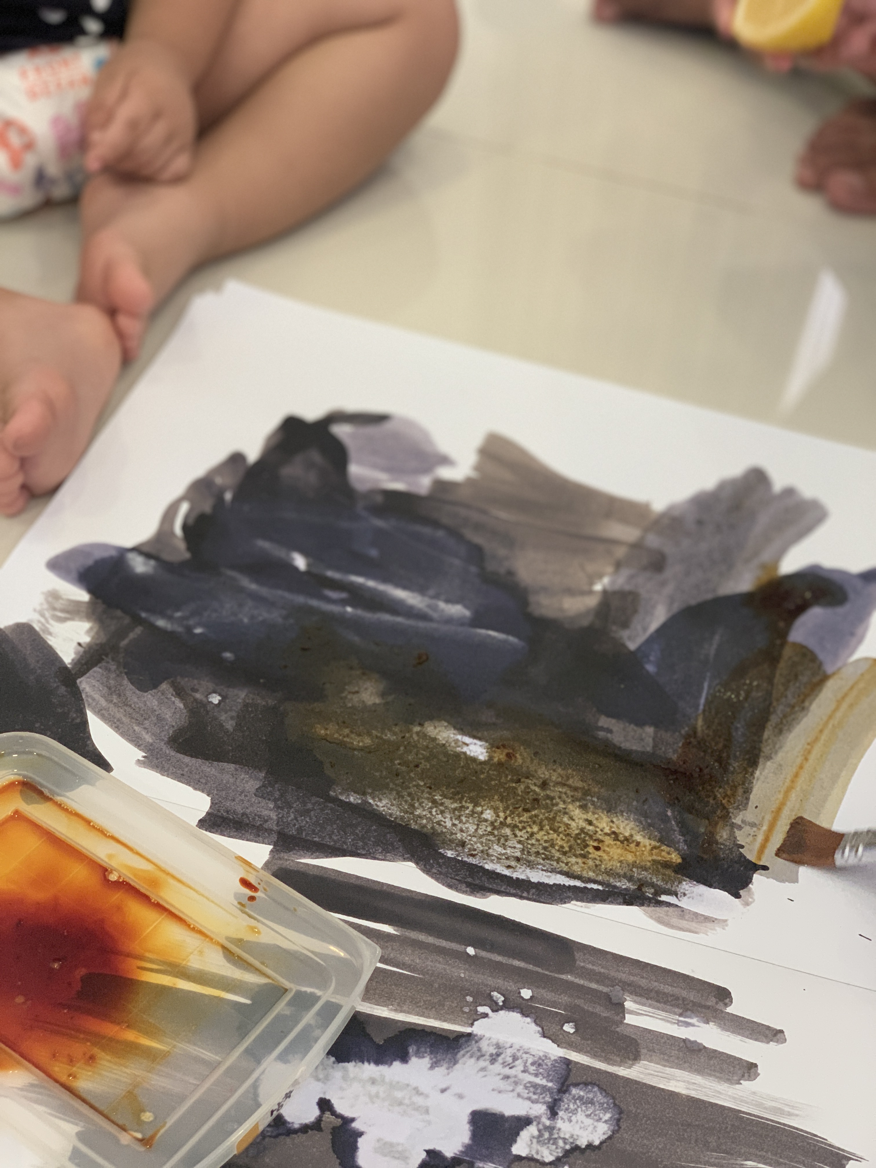 계획없이 시작한 미술활동이었어서 사진이 영 친절하지 않네요 ㅋ 손으로 뭔가 집을 수 있는 월령부터 유치원시기 아이들까지 재미있게 활동이 가능한 미술입니다. 영아는 손으로 만져보고 맛보는 시간을 좀 더 오래, 아이들은 색이 변하는 과정소개, 그리기 시간을 더 늘리면 됩니다.