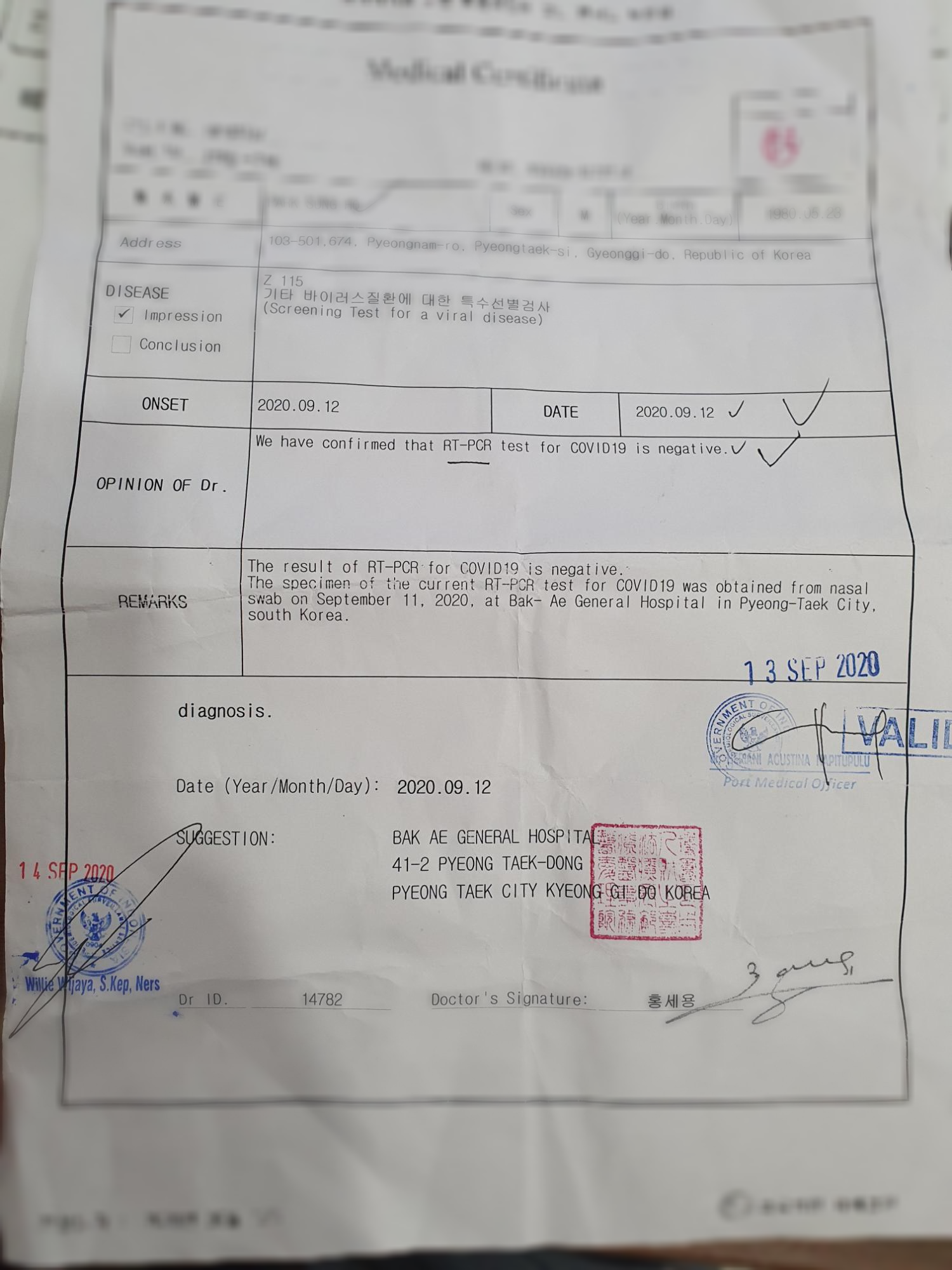 - Covid-19 음성확인서(영문) : 발급7일이내, PCR테스트