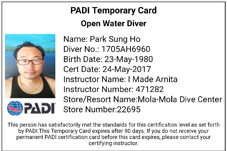 교육을 이수하면 90일간 유효한 임시자격증을 위와 같이 이메일로 발급을 해주고, 호주 PADI본사에서 발급하는 정식자격증은 한달내에 한국으로 발송한다고 합니다^^ 참고하세요~