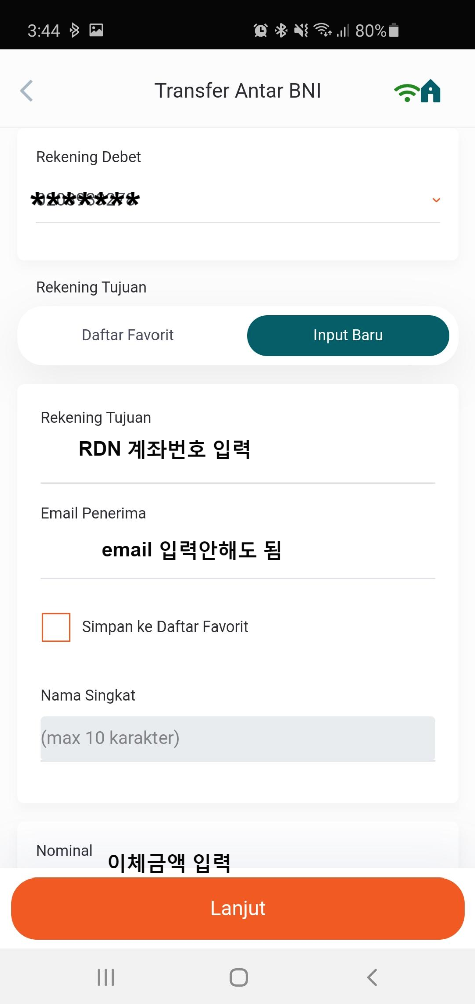 3> BNI모바일뱅크 로그인 -> Transfer(이체) -> RDN계좌번호 / 이체금액입력 -> 이체비밀번호 입력!