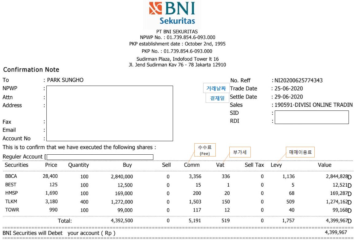 - 내가 거래하는 BNI Sekuritas는 매수할 때 0.17%, 매도할 때 0.27%